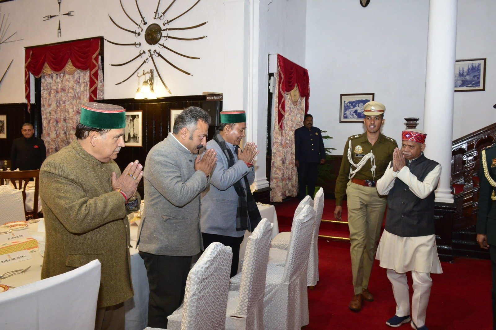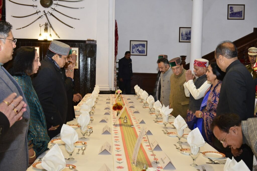 शिमला, राज्यपाल शिव प्रताप शुक्ल ने सोमवार को राजभवन में हिमाचल प्रदेश विधानसभा के विधायकों के लिये बजट सत्र के दौरान ‘‘स्टेट डिनर’’ का आयोजन किया। लेडी गवर्नर श्रीमती जानकी शुक्ला, उप-मुख्यमंत्री श्री मुकेश अग्निहोत्री तथा उनकी धर्मपत्नी श्रीमती सिम्मी अग्निहोत्री भी इस अवसर पर उपस्थित थे।