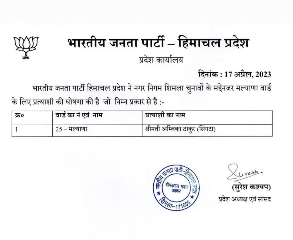 News भाजपा ने नगर निगम चुनाव के लिए मल्याणा वार्ड से अम्बिका ठाकुर को उम्मीदवार बनाया by Himachalaajkal April 18, 2023 Share FacebookTwitterPinterestWhatsApp Previous articleकांग्रेस ने नगर निगम चुनाव के लिए 8 उम्मीदवारों की अंतिम सूची जारी कीNext articleराष्ट्रपति का शिमला पहुंचने पर गर्मजोशी से स्वागत Himachalaajkalhttp://himachalaajkal.in Get in Touch LEAVE A REPLY Cancel reply Comment: Please enter your comment! Name:* Please enter your name here Email:* You have entered an incorrect email address! Please enter your email address here Website: Save my name, email, and website in this browser for the next time I comment. Related Articles News मुख्यमंत्री की ऊना जिले को 260 करोड़ की सौगात News विकास की दृष्टिकोण से पीछे न रहे चौपाल, मिलजुल कर करेंगे प्रयास : रोहित ठाकुर News राज्यपाल ने धर्मसंघ महाविद्यालय, नई दिल्ली का किया दौराआध्यात्मिक संस्थान भारत की सांस्कृतिक विरासत के संवाहक: राज्यपाल Live Cricket ScoresShimla, Himachal Pradesh weather forecast hourly