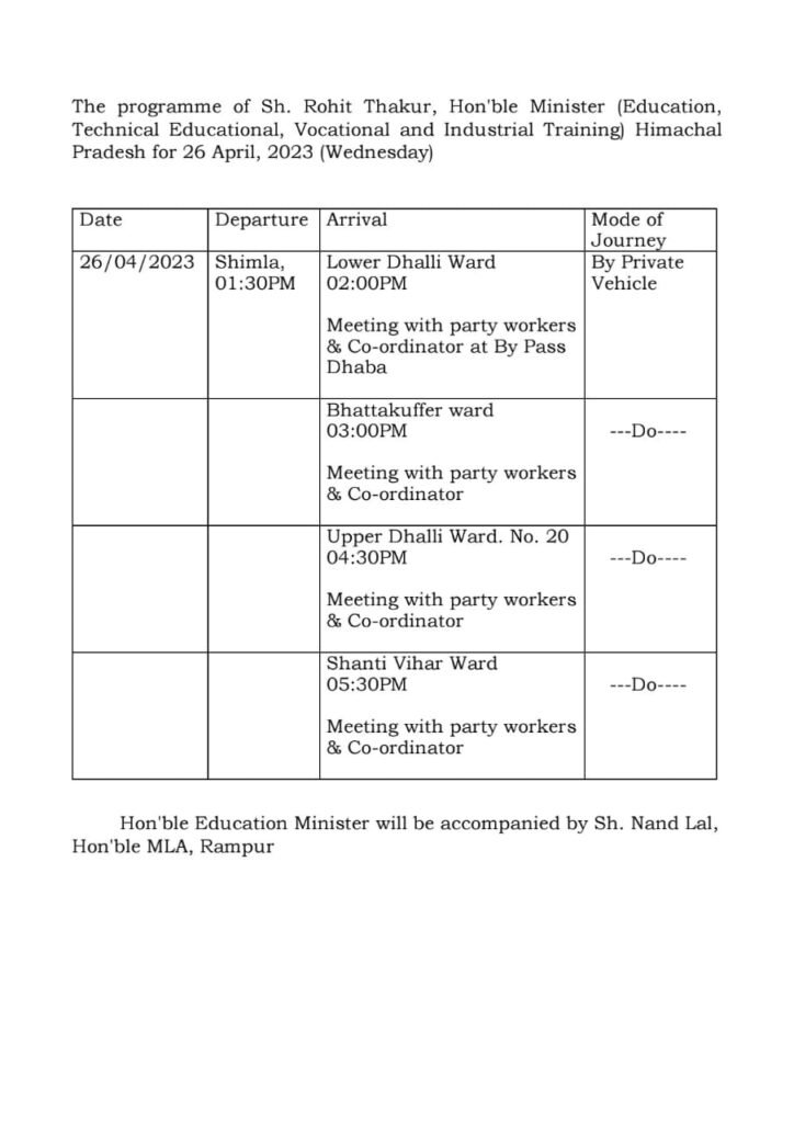 शिमला, शिक्षा मंत्री व नगर निगम, शिमला के चुनाव प्रबंधन कमेटी के अध्यक्ष रोहित ठाकुर बुधवार को लोअर ढली वार्ड, भट्टाकुफर वार्ड, अपर ढली वार्ड और शांति विहार वार्ड का दौरा कर कांग्रेस कार्यकर्ताओं के साथ बैठक करेंगें। शिक्षा मंत्री के साथ इस दौरे में रामपुर के विधायक नन्द लाल भी मौजूद रहेंगे।
