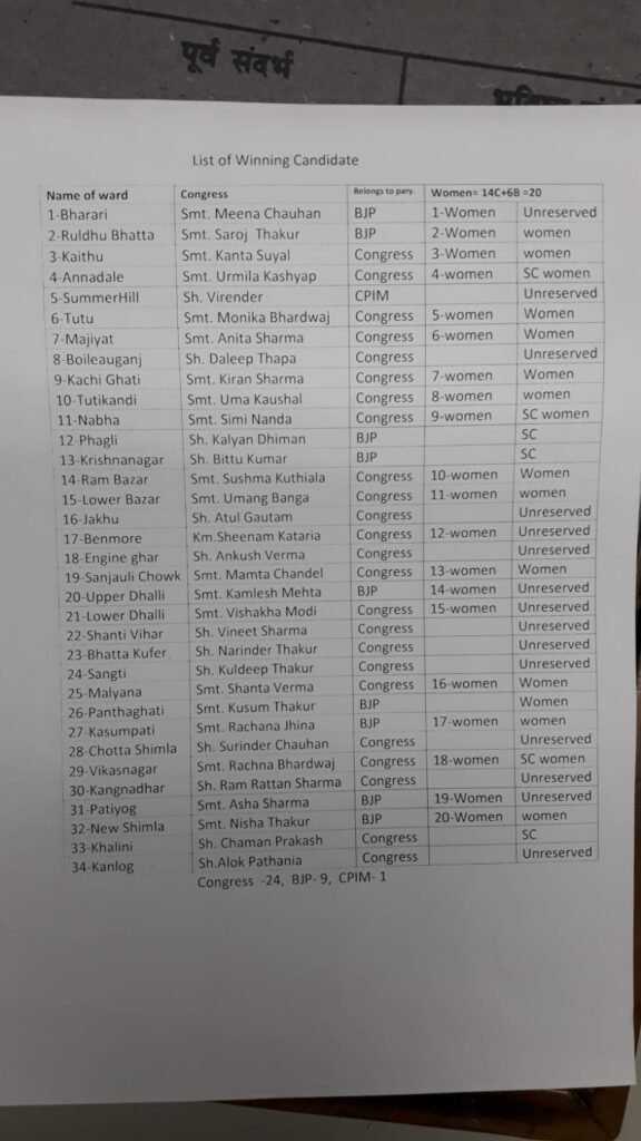News नगर निगम चुनाव में कांग्रेस को पूर्ण बहुमत, कांग्रेस 24, भाजपा 9, और माकपा 1सीट जीती by Himachalaajkal May 4, 2023 Share FacebookTwitterPinterestWhatsApp Previous articleमुख्यमंत्री ने एसडीआरएफ का नया झंडा, लोगो और वर्दी लोकार्पित कीNext articleशिमला की जनता ने कांग्रेस सरकार के कार्यक्रमों पर लगाई मुहर : सुक्खू Himachalaajkalhttp://himachalaajkal.in Get in Touch LEAVE A REPLY Cancel reply Comment: Please enter your comment! Name:* Please enter your name here Email:* You have entered an incorrect email address! Please enter your email address here Website: Save my name, email, and website in this browser for the next time I comment. Related Articles News मुख्यमंत्री की ऊना जिले को 260 करोड़ की सौगात News विकास की दृष्टिकोण से पीछे न रहे चौपाल, मिलजुल कर करेंगे प्रयास : रोहित ठाकुर News राज्यपाल ने धर्मसंघ महाविद्यालय, नई दिल्ली का किया दौराआध्यात्मिक संस्थान भारत की सांस्कृतिक विरासत के संवाहक: राज्यपाल Live Cricket ScoresShimla, Himachal Pradesh weather forecast hourly
