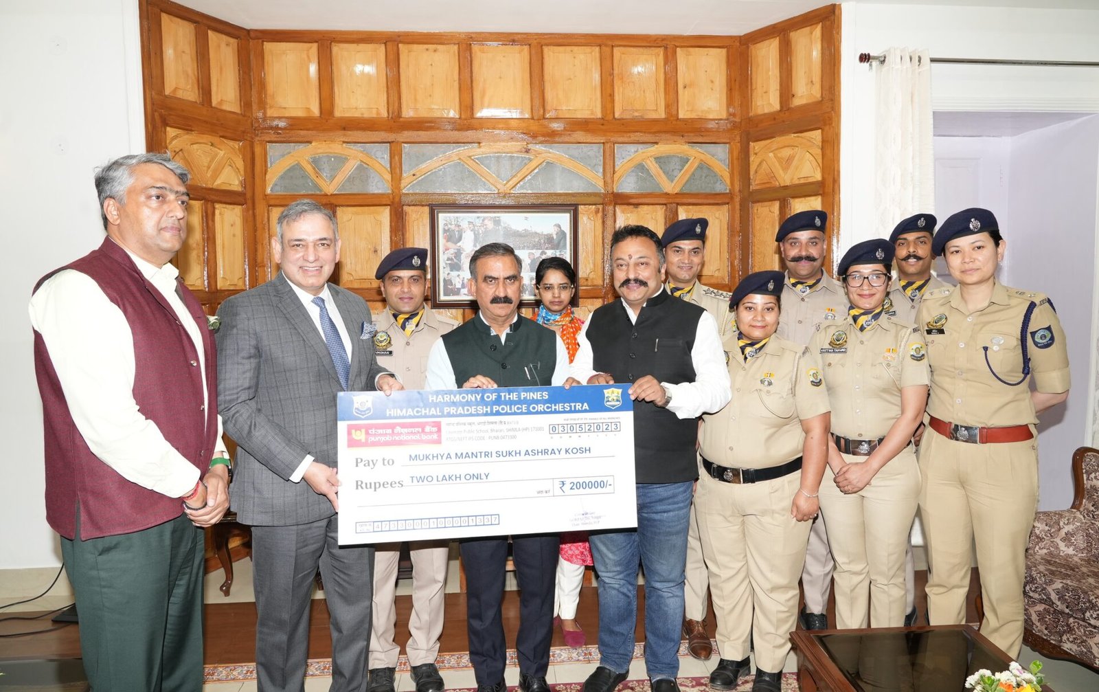 शिमला। हिमाचल प्रदेश पुलिस आर्केस्ट्रा, हार्मनी ऑफ द पाइंस, ने बुधवार को शिमला में मुख्यमंत्री ठाकुर सुखविंदर सिंह सुक्खू को मुख्यमंत्री सुख आश्रय कोष के लिए 2 लाख रुपए का चेक भेंट किया। शिक्षा मंत्री रोहित ठाकुर और डीजीपी संजय कुंडू भी इस अवसर पर उपस्थित थे।