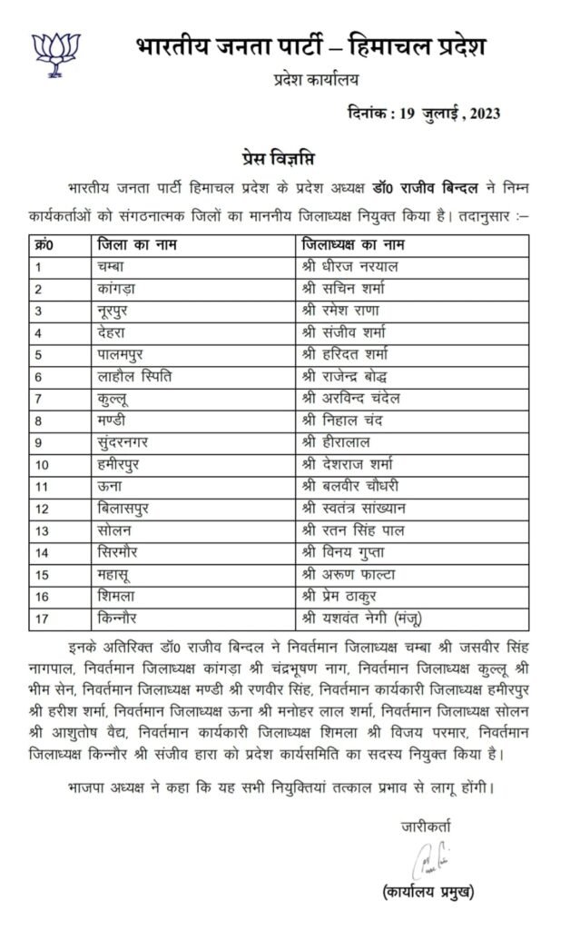 शिमला। प्रदेश भाजपा अध्यक्ष डा. राजीव बिंदल ने भाजपा के 17 संगठनात्मक जिलों के जिला अध्यक्षों की नियुक्ति की है। उन्होंने बताया कि चंबा जिला के अध्यक्ष के रूप में धीरज नरयाल, कांगड़ा सचिन शर्मा, नूरपुर रमेश राणा, देहरा संजीव शर्मा, पालमपुर हरिदत्त शर्मा, लाहौल स्पीति राजेंद्र बोद्घ, कुल्लू अरविंद चंदेल, मंडी निहाल चंद, सुंदरनगर हीरा लाल, हमीरपुर देशराज शर्मा, ऊना बलबीर चौधरी, बिलासपुर स्वतंत्र संख्यान, सोलन रत्न सिंह पाल, सिरमौर विनय गुप्ता, महासू अरुण फाल्टा, शिमला प्रेम ठाकुर, किन्नौर यशवंत नेगी को जिला अध्यक्ष के तौर पर नियुक्त किया।
