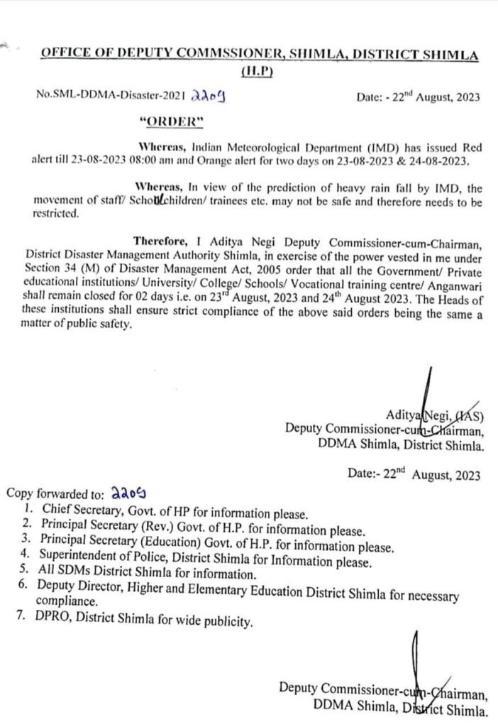 News जिला शिमला में 23। व 24 अगस्त को सभी शैक्षणिक संस्थान बंद रहेंगे। by Himachalaajkal August 22, 2023 Share FacebookTwitterPinterestWhatsApp Previous articleहिमाचल प्रदेश मंत्रिमण्डल के निर्णयNext articleशिमला के नाभा में पेड़ गिरने से हेरिटेज भवन को खतरा Himachalaajkalhttp://himachalaajkal.in Get in Touch LEAVE A REPLY Cancel reply Comment: Please enter your comment! Name:* Please enter your name here Email:* You have entered an incorrect email address! Please enter your email address here Website: Save my name, email, and website in this browser for the next time I comment. Related Articles News मुख्यमंत्री ने किया राज्य स्तरीय हरोली उत्सव-2026 का शुभारंभ News मुख्यमंत्री की ऊना जिले को 260 करोड़ की सौगात News विकास की दृष्टिकोण से पीछे न रहे चौपाल, मिलजुल कर करेंगे प्रयास : रोहित ठाकुर Live Cricket ScoresShimla, Himachal Pradesh weather forecast hourly