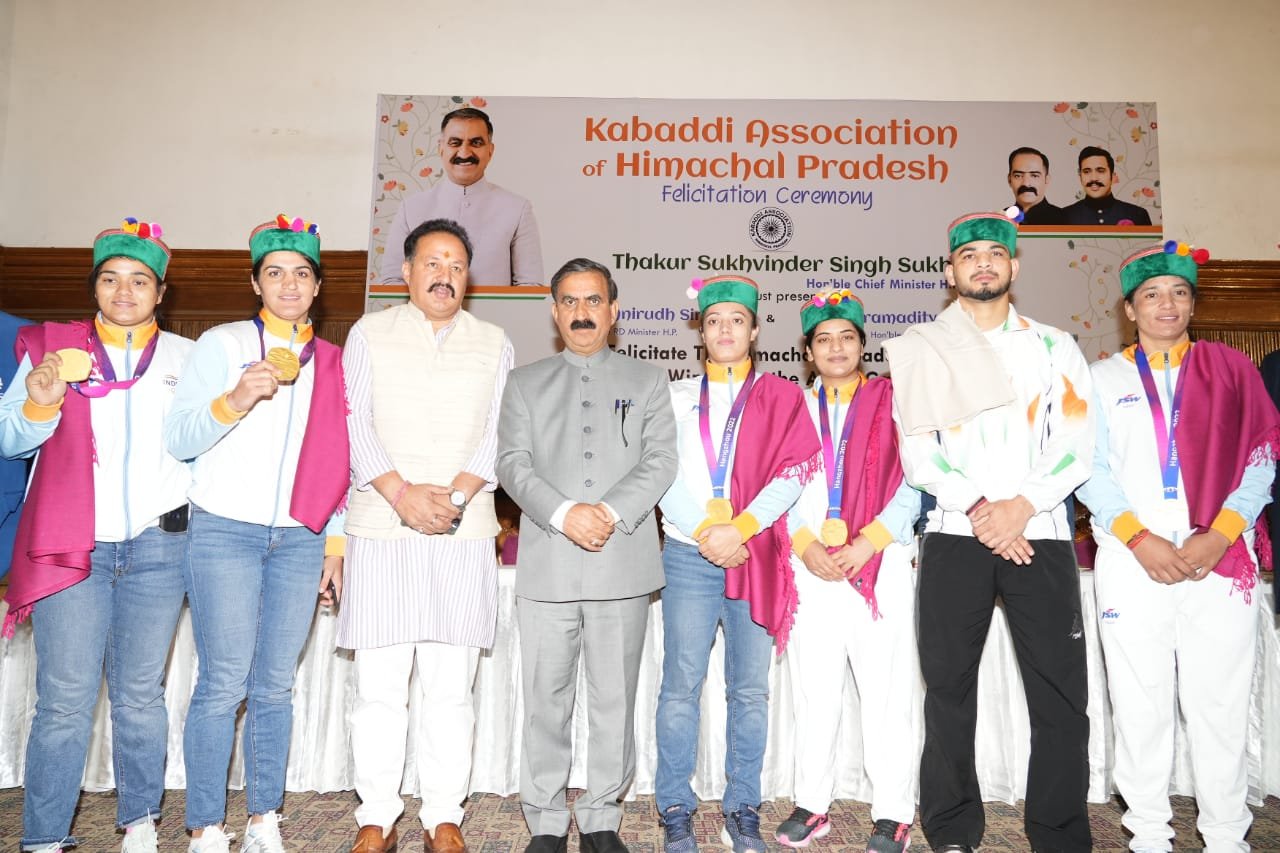 शिमला, मुख्यमंत्री ठाकुर सुखविंदर सिंह सुक्खू ने सोमवार को पीटरहॉफ शिमला में हिमाचल प्रदेश कबड्डी एसोसिएशन द्वारा आयोजित सम्मान समारोह में चीन के हांगझोऊ में सम्पन्न एशियाई खेलों में स्वर्ण पदक विजेता खिलाड़ियों को सम्मानित किया।