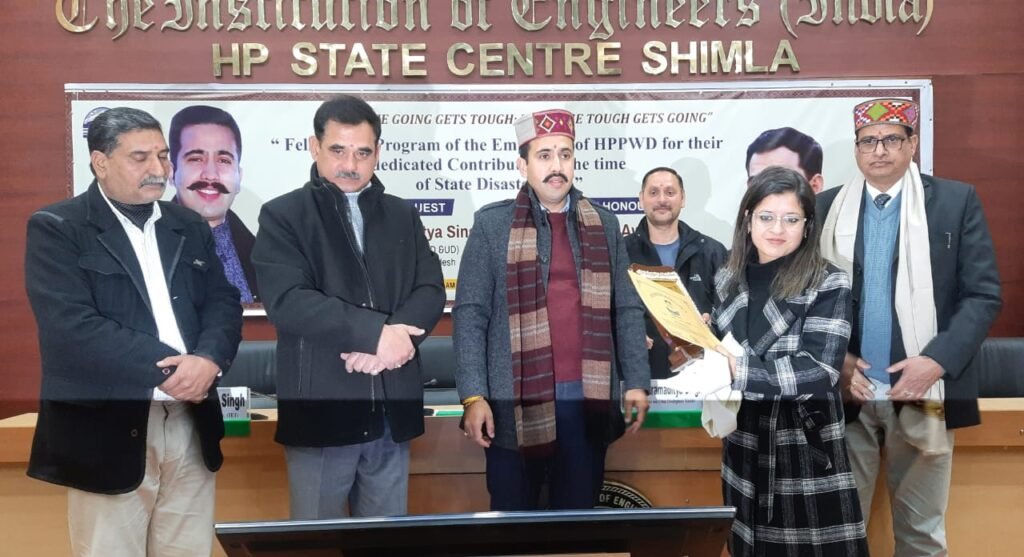 कैबिनेट मंत्री विक्रमादित्य सिंह ने आपदा काल के दौरान पूरे प्रदेश में सडक़े खोलने के लिए उत्ष्ट एवं प्रशंसनीय कार्य करने वाले लोक निर्माण विभाग के 31 इंजीनियरों व फील्ड स्टाफ के अन्य अधिकारियों व कर्मचारियों को सम्मानित किया, जिसमें अधिशाषी अभियंता मनाली मंडल अनुप कुमार शर्मा, अधिशाषी अभियंता राजकीय उच्च मार्ग रामपुर केएलसुमन, अधिशाषी अभियंता यांत्रिक अमित शर्मा, सहायक अभियंताआें में नरेन्द्र कुमार, विनायक कश्यप, अलोक जनवेजा, मनीष ठाकुर, अखिल चौहान, कनव बडोतरा, भीम सिंह नेगी, डीके नाग व भावेश चतुर्वेदी, कनिष्ठ अभियंताआें में चन्द्र भानू, बांकू दीन कुरैशी, मनोज कुमार शर्मा, अभिमन्यु मैहरा, साहिल चौधरी, कृष्ण कुमार, जसवंत कुमार, शीतल शर्मा, मीनस शर्मा, वर्क इन्सपैक्टरों में अमित कुमार, हरवंस कुमार, शंकर देव, मैकेनिकल टेक्रिशियन, जेसीबी अपरेटरों तथा बेलदरों में मिलाप सिंह, संजीव कुमार, सुभाष सिंह, गिरधारी लाल, डंडू लाल, विजय कुमार व श्याम लाल को प्रशस्ति पत्र व मोमेंटो देकर सम्मानित किया गया।
