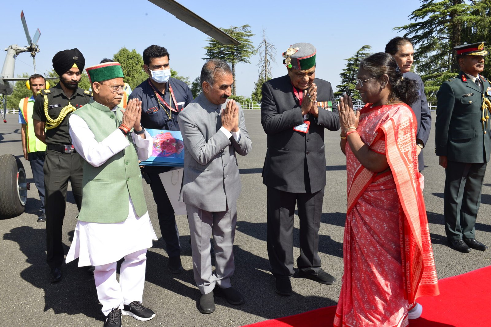 शिमला। हिमाचल प्रदेश के पांच दिवसीय प्रवास के बाद आज राष्ट्रपति श्रीमती द्रौपदी मुर्मु को मशोबरा स्थित कल्याणी हेलीपैड में गरिमापूर्ण विदाई दी गई। इस अवसर पर राज्यपाल शिव प्रताप शुक्ल और मुख्यमंत्री ठाकुर सुखविंदर सिंह सुक्खू भी उपस्थित थे।