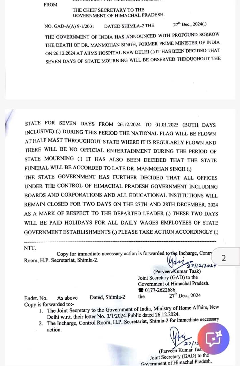 News राजकीय शोक : हिमाचल में दो दिन सरकारी अवकाश घोषित, सरकार ने जारी की अधिसूचना, अब सोमवार को खुलेंगे सरकारी कार्यालय by Himachalaajkal December 27, 2024 Share FacebookTwitterPinterestWhatsApp Previous articleपूर्व प्रधानमंत्री मनमोहन सिंह का निधन दिल्ली के एम्स में ली अंतिम सांसNext articleविद्युत मंत्रालय के संयुक्त सचिव (हाइड्रो) ने किया नाथपा झाकड़ी हाइड्रो पवर स्टेशन का दौरा Himachalaajkalhttp://himachalaajkal.in Get in Touch LEAVE A REPLY Cancel reply Comment: Please enter your comment! Name:* Please enter your name here Email:* You have entered an incorrect email address! Please enter your email address here Website: Save my name, email, and website in this browser for the next time I comment. Related Articles News मुख्यमंत्री को होली उत्सव के लिए आमंत्रित किया News ग्रामीण बैंक ने मुख्यमंत्री आपदा राहत कोष में दिया योगदान News मुख्यमंत्री ने किसी भी पात्र व्यक्ति की सामाजिक सुरक्षा पेंशन बंद नहीं करने के निर्देश दिए Live Cricket ScoresShimla, Himachal Pradesh weather forecast hourly