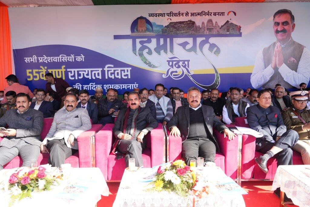 शिमला। मुख्यमंत्री ठाकुर सुखविंद्र सिंह सुक्खू ने आज कांगड़ा जिले के बैजनाथ में आयोजित 55वें पूर्ण राज्यत्व दिवस समारोह के दौरान हिमाचल प्रदेश के लोगों को शुभकामनाएं दीं। उन्होंने राज्यत्व दिवस के अवसर पर पूर्व प्रधानमंत्री इंदिरा गांधी और हिमाचल प्रदेश के पहले मुख्यमंत्री डा$ वाई$ एस$ परमार के अपार योगदान को याद किया। मुख्यमंत्री ने राष्ट्रीय ध्वज फहराया और पुलिस, होमगार्ड, आईआरबी बस्सी, आईआरबी सकोह, एसएसबी सपरी, जिला पुलिस कांगड़ा, यातायात पुलिस, एनसीसी कैडेट्स, स्काउट्स एंड गाइड्स और पुलिस बैंड की टुकडिय़ों की सलामी ली। परेड कमांडर आईपीएस (प्रोबेशनर) रविनंदन के नेतृत्व में शानदार मार्च पास्ट प्रस्तुत किया गया।