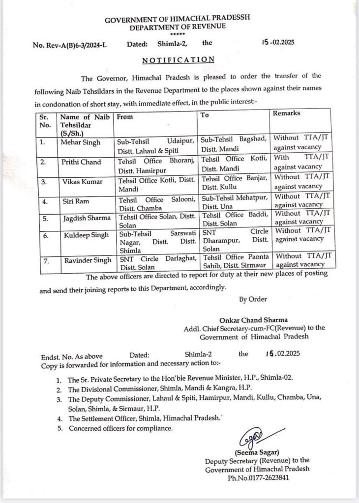 News सरकार ने 7 नायब तहसीलदारों के तबाबदले किए by Himachalaajkal February 15, 2025 Share FacebookTwitterPinterestWhatsApp Previous articleमुख्यमंत्री की अध्यक्षता में राज्य एकल खिड़की स्वीकृति एवं अनुश्रवण प्राधिकरण की 30वीं बैठक आयोजितNext articleहिमाचल प्रदेश में सडक़ दुर्घटनाओं में 6. 48 फीसदी की कमी आई : सुक्खू Himachalaajkalhttp://himachalaajkal.in Get in Touch LEAVE A REPLY Cancel reply Comment: Please enter your comment! Name:* Please enter your name here Email:* You have entered an incorrect email address! Please enter your email address here Website: Save my name, email, and website in this browser for the next time I comment. Related Articles News मुख्यमंत्री से नादौन विधानसभा क्षेत्र के बड़ा और फस्टे ग्राम पंचायत के प्रतिनिधिमंडल ने की मुलाक़ात News समावेशी शासन की दिशा में सशक्त कदमः सामाजिक सुरक्षा से सुदृढ़ हो रहा वंचित वर्ग News शिक्षा मंत्री ने निजी बस हादसे में 14 लोगों की मृत्यु पर शोक व्यक्त किया Live Cricket ScoresShimla, Himachal Pradesh weather forecast hourly