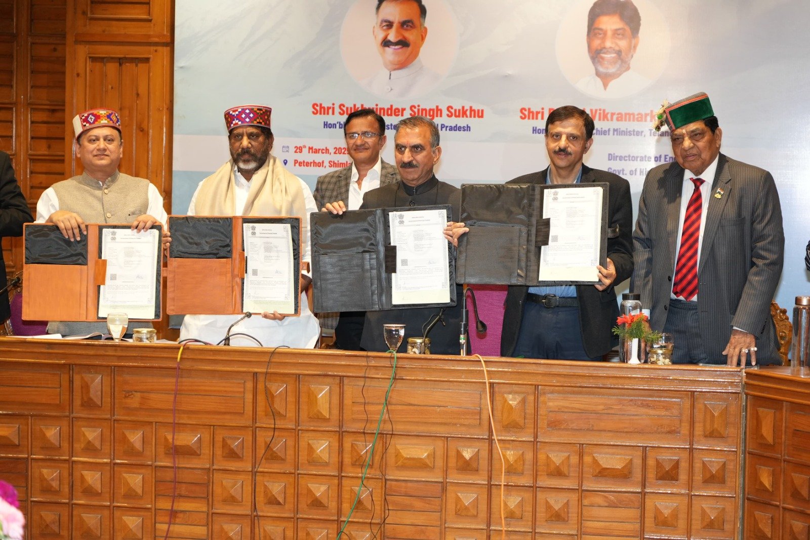 इन समझौता ज्ञापनों पर मुख्यमंत्री ठाकुर सुखविंद्र सिंह सुक्खू तथा तेलंगाना के उप-मुख्यमंत्री भट्टी विक्रमार्क मल्लू की उपस्थिति में हिमाचल प्रदेश सरकार की ओर से ऊर्जा सचिव राकेश कंवर तथा तेलंगाना सरकार की ओर से प्रधान सचिव ऊर्जा संदीप कुमार सुल्तानिया ने हस्ताक्षर किए।
