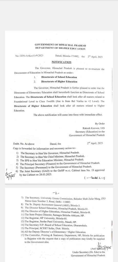 शिमला। प्रदेश सरकार ने शिक्षा क्षेत्र के बेहतर प्रबंधन के लिए शिक्षा निदेशालयों के पुनर्गठन की अधिसूचना आज जारी कर दी है। शिक्षा निदेशालयों को स्कूल शिक्षा निदेशालय और उच्च शिक्षा निदेशालय के रूप में पुनर्गठित किया गया है।
