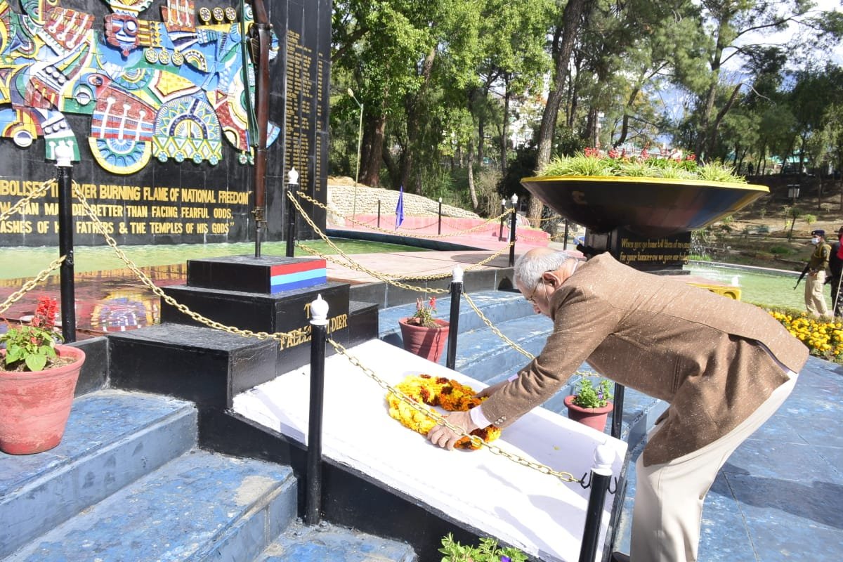 शिमला। राज्यपाल राजेंद्र विश्वनाथ आर्लेकर ने आज कांगड़ा जिले के धर्मशाला स्थित शहीद स्मारक का दौरा किया और देश के लिए अपना सर्वोच्च बलिदान देने वाले 163 वीर शहीदों को श्रद्धासुमन अर्पित किए। उन्होंने अमर जवान ज्योति प्रज्ज्वलित कर शहीदों का स्मरण किया। यह पहला मौका है जब प्रदेश के किसी राज्यपाल ने शहीद स्मारक धर्मशाला का दौरा किया।