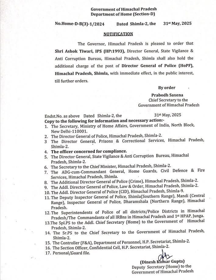 News आईपीएस अशोक तिवारी को डीजीपी का अतिरिक्त कार्यभार, अधिसूचना जारी by Himachalaajkal May 31, 2025 Share FacebookTwitterPinterestWhatsApp Previous articleरोहड़ू , चिडग़ांव व नारकंडा की पंचायतों में किसान जागरूकता कार्यक्रम आयोजितNext articleराज्यपाल आज करेंगे शिमला ग्रीष्मोत्सव की पहली सांस्कृतिक संध्या का शुभारम्भ Himachalaajkalhttp://himachalaajkal.in Get in Touch LEAVE A REPLY Cancel reply Comment: Please enter your comment! Name:* Please enter your name here Email:* You have entered an incorrect email address! Please enter your email address here Website: Save my name, email, and website in this browser for the next time I comment. Related Articles News शिमला। मुख्यमंत्री सुखविंद्र सिंह सुक्खू ने आज आईजीएमसी में विधायक और 7वें राज्य वित्त आयोग के चेयरमैन नंद लाल का हालचाल जाना। मुख्यमंत्री ने... News मुख्यमंत्री को होली उत्सव के लिए आमंत्रित किया News ग्रामीण बैंक ने मुख्यमंत्री आपदा राहत कोष में दिया योगदान Live Cricket ScoresShimla, Himachal Pradesh weather forecast hourly