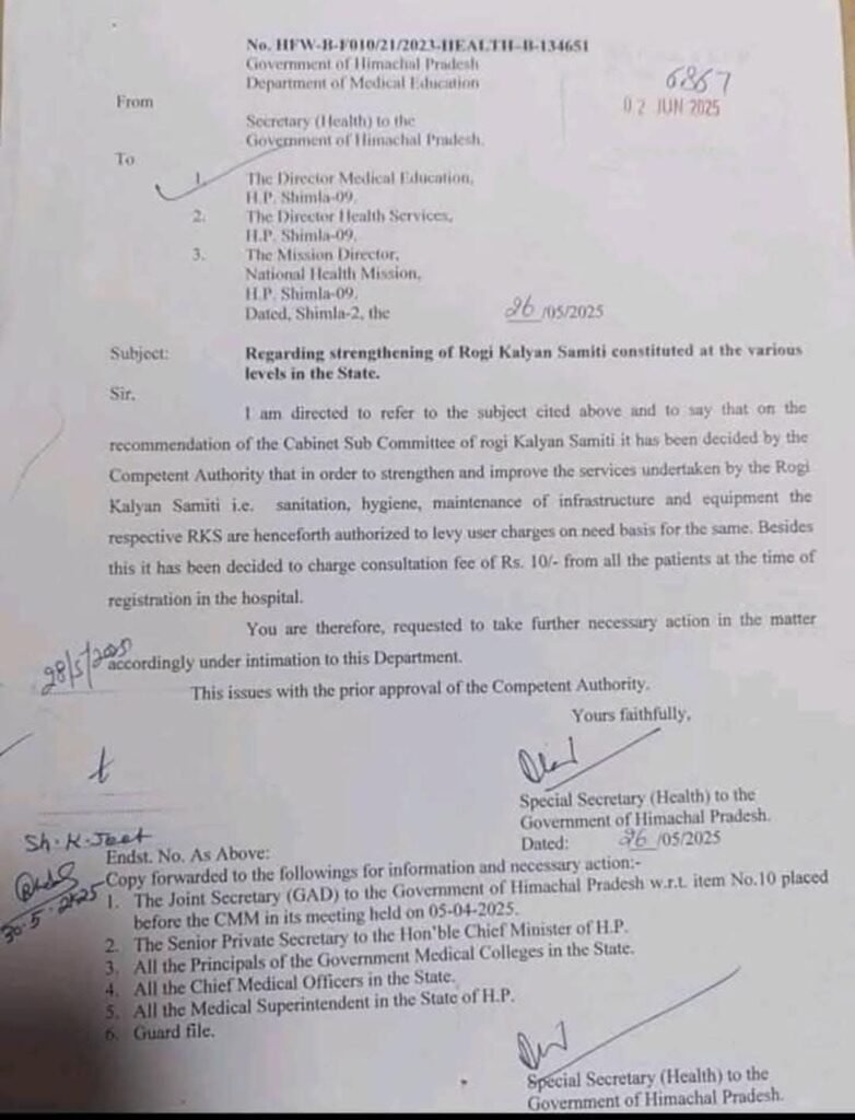 स्वास्थ हिमाचल के सरकारी अस्पतालों में 5 जून से लगेंगे पर्ची बनाने के 10 रुपए , अधिसूचना जारी by Himachalaajkal June 4, 2025 Share FacebookTwitterPinterestWhatsApp Previous articleमुख्यमंत्री ने देहरा विधानसभा क्षेत्र में 100 करोड़ की विकासात्मक परियोजनाओं के लोकार्पण और शिलान्यास किएNext articleहिमाचल यूनिवर्सिटी के नव नियुक्त वाइस चांसलर प्रो. महावीर सिंह ने मुख्यमंत्री सुखविंदर सिंह सुक्खू से मुलाकात की Himachalaajkalhttp://himachalaajkal.in Get in Touch LEAVE A REPLY Cancel reply Comment: Please enter your comment! Name:* Please enter your name here Email:* You have entered an incorrect email address! Please enter your email address here Website: Save my name, email, and website in this browser for the next time I comment. Related Articles स्वास्थ स्वास्थ्य सेवाओं में ऑनलाइन सुविधाओं का समावेश किया जाएगा: मुख्यमंत्री स्वास्थ चिकित्सा महाविद्यालयों के लिए सीनियर रेजिडेंटशिप पॉलिसी बनाई जाएगी-: मुख्यमंत्री स्वास्थ 213.75 करोड़ के निवेश से बेहतर होगी स्वास्थ्य सुविधाएं Live Cricket ScoresShimla, Himachal Pradesh weather forecast hourly