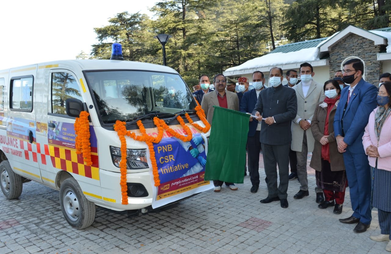 शिमला, मुख्यमंत्री जयराम ठाकुर ने ओक ओवर, शिमला से चैपाल क्षेत्र के कुपवी खण्ड के लिए पंजाब नेशनल बैंक द्वारा भेंट की गई एम्बुलेंस को झंडी दिखाकर रवाना किया।