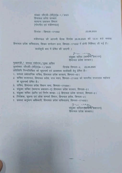 News प्रदेश कैबिनेट की बैठक 28 जून को 12 बजे होगी by Himachalaajkal June 23, 2025 Share FacebookTwitterPinterestWhatsApp Previous articleमुख्यमंत्री ने राष्ट्रीय आइस स्केटिंग चैँपियनशिप के लिए राज्य के दल को रवाना कियाNext articleजुब्बल नावर कोटखाई की जनता की सेवा ही मेरे जीवन का उद्देश्य : रोहित ठाकुर Himachalaajkalhttp://himachalaajkal.in Get in Touch LEAVE A REPLY Cancel reply Comment: Please enter your comment! Name:* Please enter your name here Email:* You have entered an incorrect email address! Please enter your email address here Website: Save my name, email, and website in this browser for the next time I comment. Related Articles News मुख्यमंत्री से नादौन विधानसभा क्षेत्र के बड़ा और फस्टे ग्राम पंचायत के प्रतिनिधिमंडल ने की मुलाक़ात News समावेशी शासन की दिशा में सशक्त कदमः सामाजिक सुरक्षा से सुदृढ़ हो रहा वंचित वर्ग News शिक्षा मंत्री ने निजी बस हादसे में 14 लोगों की मृत्यु पर शोक व्यक्त किया Live Cricket ScoresShimla, Himachal Pradesh weather forecast hourly