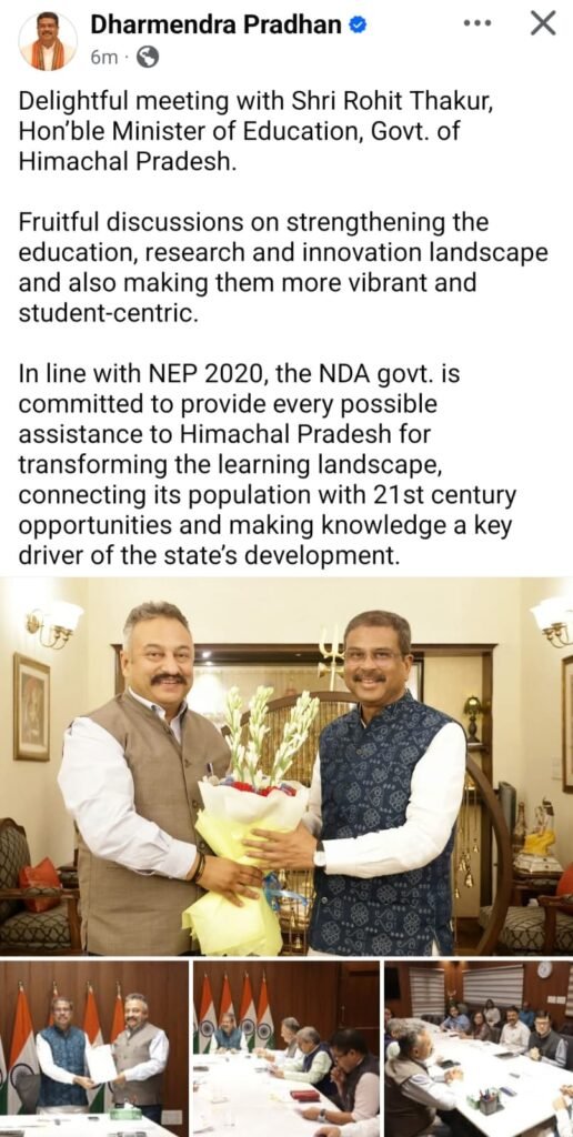 शिमलाल केंद्रीय शिक्षा मंत्री धर्मेंद्र प्रधान की अध्यक्षता में नई दिल्ली में चल रहे “अखिल भारतीय शिक्षा समागम -2025” के दौरान आज हिमाचल के शिक्षा मंत्र मंत्री रोहित ठाकुर की केंद्रीय शिक्षा मंत्री के साथ शिष्टाचार मुलाकात हुई। शिक्षा मंत्री रोहित ठाकुर ने सभी राज्य के शिक्षा मंत्रियों के साथ बैठक में भाग लिया।