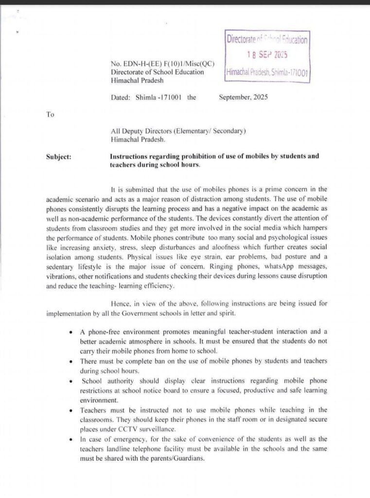 शिक्षा हिमाचल के स्कूलों में मोबाइल प्रयोग पर रोक by Himachalaajkal September 19, 2025 Share FacebookTwitterPinterestWhatsApp Previous articleसड़कों को नुकसान के बावजूद बाजार में सेब आमद में वृद्धि दर्जNext articleप्रदेश सरकार अगले सत्र से राज्य के 100 स्कूलों में सीबीएसई Himachalaajkalhttp://himachalaajkal.in Get in Touch LEAVE A REPLY Cancel reply Comment: Please enter your comment! Name:* Please enter your name here Email:* You have entered an incorrect email address! Please enter your email address here Website: Save my name, email, and website in this browser for the next time I comment. Related Articles शिक्षा शिक्षा मंत्री रोहित ठाकुर की अगुवाई में तेलंगाना पहुंचा हिमाचल का दल, मुख्यमंत्री ए. रेवंत रेड्डी के साथ हुई बैठक, तेलंगाना का स्किल और... शिक्षा हिमाचल में 1,968 स्कूल क्लस्टर बनाए गए : सुक्खू शिक्षा शिक्षा मंत्री ने अरसू स्कूल में वार्षिक पुरस्कार वितरण समारोह में शिरकत की Live Cricket ScoresShimla, Himachal Pradesh weather forecast hourly