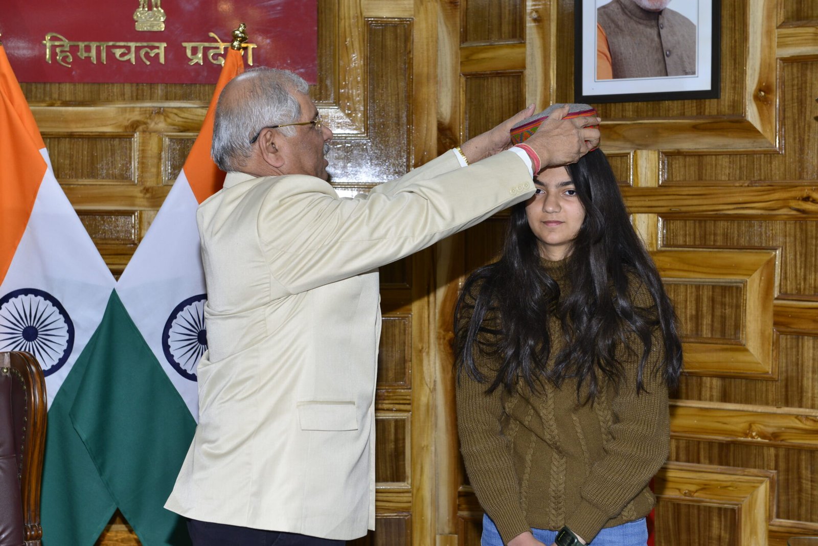 शिमला राज्यपाल राजेन्द्र विश्वनाथ आर्लेकर से आज राजभवन में राष्ट्रीय बाल पुरस्कार से सम्मानित मण्डी जिले के सुंदरनगर उप-मंडल की निवासी कुमारी श्रिया लोहिया ने भेंट की। इस अवसर पर राज्यपाल ने कुमारी श्रिया को उनकी उपलब्धियों के लिए सम्मानित किया।