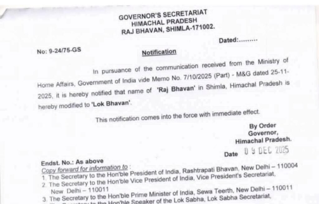 News राजभवन शिमला का नाम अब लोकभवन होगा,अधिसूचना जारी by Himachalaajkal December 10, 2025 Share FacebookTwitterPinterestWhatsApp Previous articleहिमाचल प्रदेश लोक सेवा आयोग की नवनियुक्त सदस्य ममता मोक्टा ने आज को शिमला में मुख्यमंत्री सुखविंद्र सिंह सुक्खू से मुलाकात की। यह एक शिष्टाचार मुलाकात थीNext articleनावर क्षेत्र में सडक़ों व भवनों के निर्माण के लिए 103 करोड मंजूर : रोहित ठाकुर Himachalaajkalhttp://himachalaajkal.in Get in Touch LEAVE A REPLY Cancel reply Comment: Please enter your comment! Name:* Please enter your name here Email:* You have entered an incorrect email address! Please enter your email address here Website: Save my name, email, and website in this browser for the next time I comment. Related Articles News शिक्षा मंत्री 2 मार्च को कोटखाई क्षेत्र के दौरे पर News टाहू-कथांडी के लोगों ने की शिक्षा मंत्री से मुलाकात News शिमला। मुख्यमंत्री सुखविंद्र सिंह सुक्खू ने आज आईजीएमसी में विधायक और 7वें राज्य वित्त आयोग के चेयरमैन नंद लाल का हालचाल जाना। मुख्यमंत्री ने... Live Cricket ScoresShimla, Himachal Pradesh weather forecast hourly