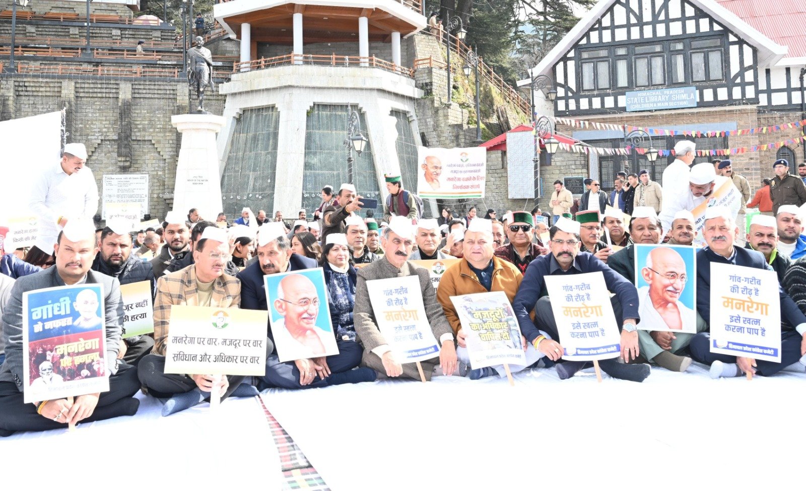 शिमला। मुख्यमंत्री ठाकुर सुखविन्द्र सिंह सुक्खू ने आज रिज मैदान शिमला में महात्मा गांधी की प्रतिमा के पास केन्द्र सरकार द्वारा मनरेगा को समाप्त करने के विरोध में अपने मंत्रिमंडल के सहयोगियों के साथ धरना दिया।