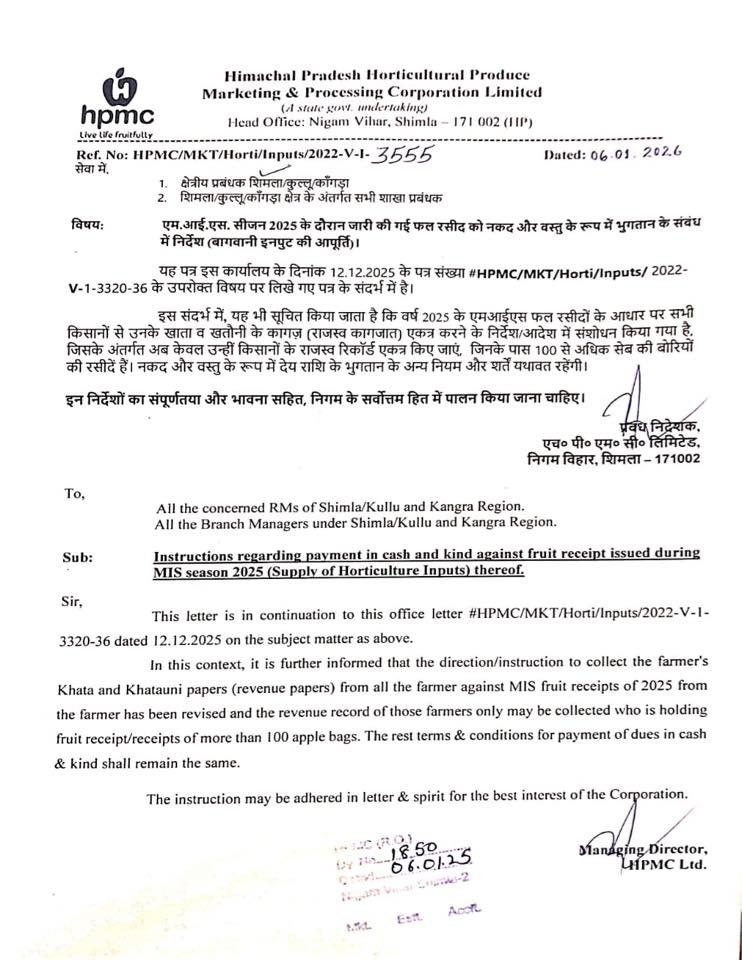 शिमला। बागवानों के भारी विरोध के बाद प्रदेश सरकार ने छोटे बागवानों को राहत दी है। जिन बागवानों के पास 100 से कम बोरियों की रसीदें है, उन बागवानों को एचपीएमसी के पास जमाबंदी देने की जरूरत नहीं होगी। इस बारे में एचपीएमसी ने निर्देश जारी किए है।