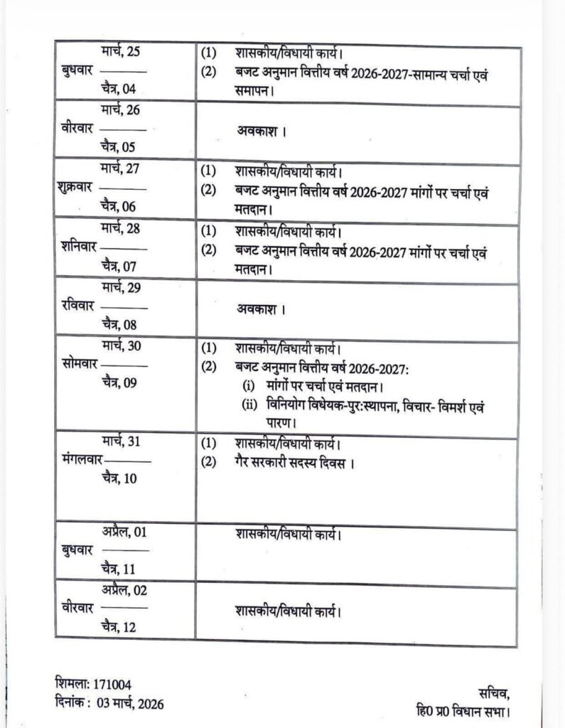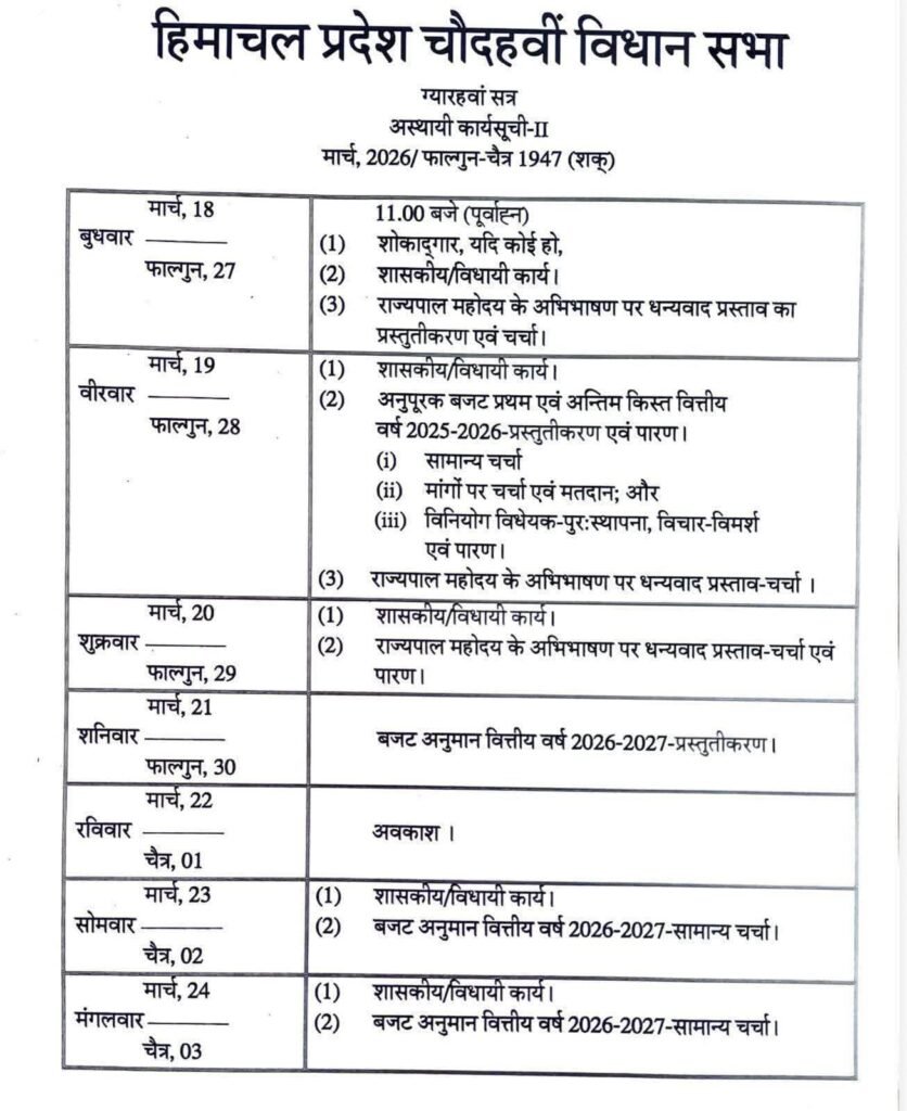 News मुख्यमंत्री सुखविंदर सिंह सुक्खू 21 मार्च को करेंगे बजट पेश by Himachalaajkal March 4, 2026 Share FacebookTwitterPinterestWhatsApp Previous articleप्रदेश सरकार ने पूर्व सैनिकों के कल्याण के लिए 17 करोड़ प्रदान किएः मुख्यमंत्री Himachalaajkalhttp://himachalaajkal.in Get in Touch LEAVE A REPLY Cancel reply Comment: Please enter your comment! Name:* Please enter your name here Email:* You have entered an incorrect email address! Please enter your email address here Website: Save my name, email, and website in this browser for the next time I comment. Related Articles News प्रदेश सरकार ने पूर्व सैनिकों के कल्याण के लिए 17 करोड़ प्रदान किएः मुख्यमंत्री News नावर के कांग्रेस कार्यकर्ताओं ने रोहित ठाकुर से मुलाकात की News भाजपा ने राज्यसभा प्रत्याशियों की सूची जारी की, नितिन नबीन को बिहार से बनाया उम्मीदवार Live Cricket ScoresShimla, Himachal Pradesh weather forecast hourly