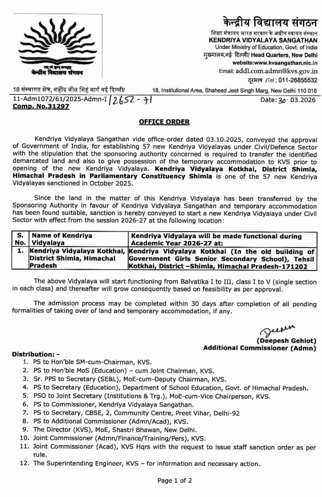 केंद्रीय विद्यालय संगठन (KVS) द्वारा जारी कार्यालय आदेश के अनुसार केंद्रीय विद्यालय, कोटखाई (जिला शिमला) को शैक्षणिक सत्र 2026–27 से प्रारंभ करने की स्वीकृति प्रदान कर दी गई है। यह निर्णय जुब्बल–नावर–कोटखाई क्षेत्र के लिए शिक्षा के क्षेत्र में एक महत्वपूर्ण उपलब्धि माना जा रहा है।