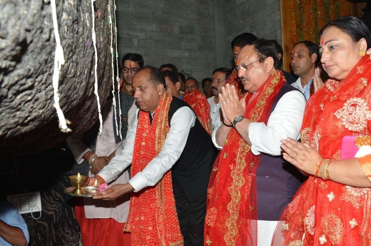 शिमला सांसद व भाजपा के राष्ट्रीय अध्यक्ष जगत प्रकाश नड्डा और मुख्यमंत्री जय राम ठाकुर ने शुक्रवार को कांगड़ा जिला के प्रसिद्ध शक्तिपीठ चामुंडा माता मन्दिर में शीश नवाया और पूजा अर्चना की। विशेष ओलंपिक भारत की अध्यक्षा एवं जगत प्रकाश नड्डा की धर्मपत्नी डॉ. मल्लिका नड्डा, सांसद एवं भाजपा के राज्य अध्यक्ष सुरेश कश्यप, सांसद किशन कपूर, हिमाचल भाजपा के सह-प्रभारी संजय टंडन, ग्रामीण विकास एवं पंचायती राज मंत्री वीरेन्द्र कंवर, वन मंत्री राकेश पठानिया, विधायक अरूण कुमार और विशाल नेहरिया, मुख्यमंत्री के राजनीतिक सलाहकार त्रिलोक जम्वाल, वूल फेडरेशन के अध्यक्ष त्रिलोक कपूर और अन्य गणमन्य व्यक्ति भी इस अवसर पर उपस्थित थे।