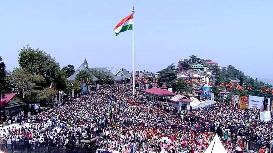 मंगलवार को शिमला में प्रधारनमंत्री की रैली में लोगों का जन सैलाब उमड़ पड़ा। प्रधानमंत्री नरेंद्र मोदी की शिमला रैली के लिए भाजपा के नेता व कार्यकर्ताओं खास जोश देखने को मिला। शिमला, सोलन व सिरमौर से लोग गाजेबाजे के साथ शिमला पहुंचे थे। भाजपा के विधायक अपने समर्थकों के साथ रैली स्थल पहुंचे। शिमला जिला के भाजपा नता व कार्यकर्ता संजौली व ढली में सुबह ही एकत्रित हुए। वहां ससे भारी संख्या में एकसाथ ऊपरी शिमला के भाजपा के समर्थक रैली स्थल तक पहुंचे। वहीं सोलन व सिरमौर से लोगा टुटीकंडी से पैदल रिज मैदान तक पहुंचे। प्रधानमंत्री की शिमला रैली के लिए प्रदेशभर से महिलाएं भी बड़ी संख्या में शिमला पहुंची थी। प्रधानमंत्री नरेंद्र मोदी के दौरे को लेकर मॉल रोड पर सडक़ के दोनों तरफ बैरिकेड लगाए थे। सुबह करीब 11.10 बजे नरेंद्र मोदी का वाहन स्र्केडल प्वाइंट से गुजरा। इस दौरान भाजपा कार्यकर्ताओं ने प्रधानमंत्री के समर्थन में नारेबाजी भी की।