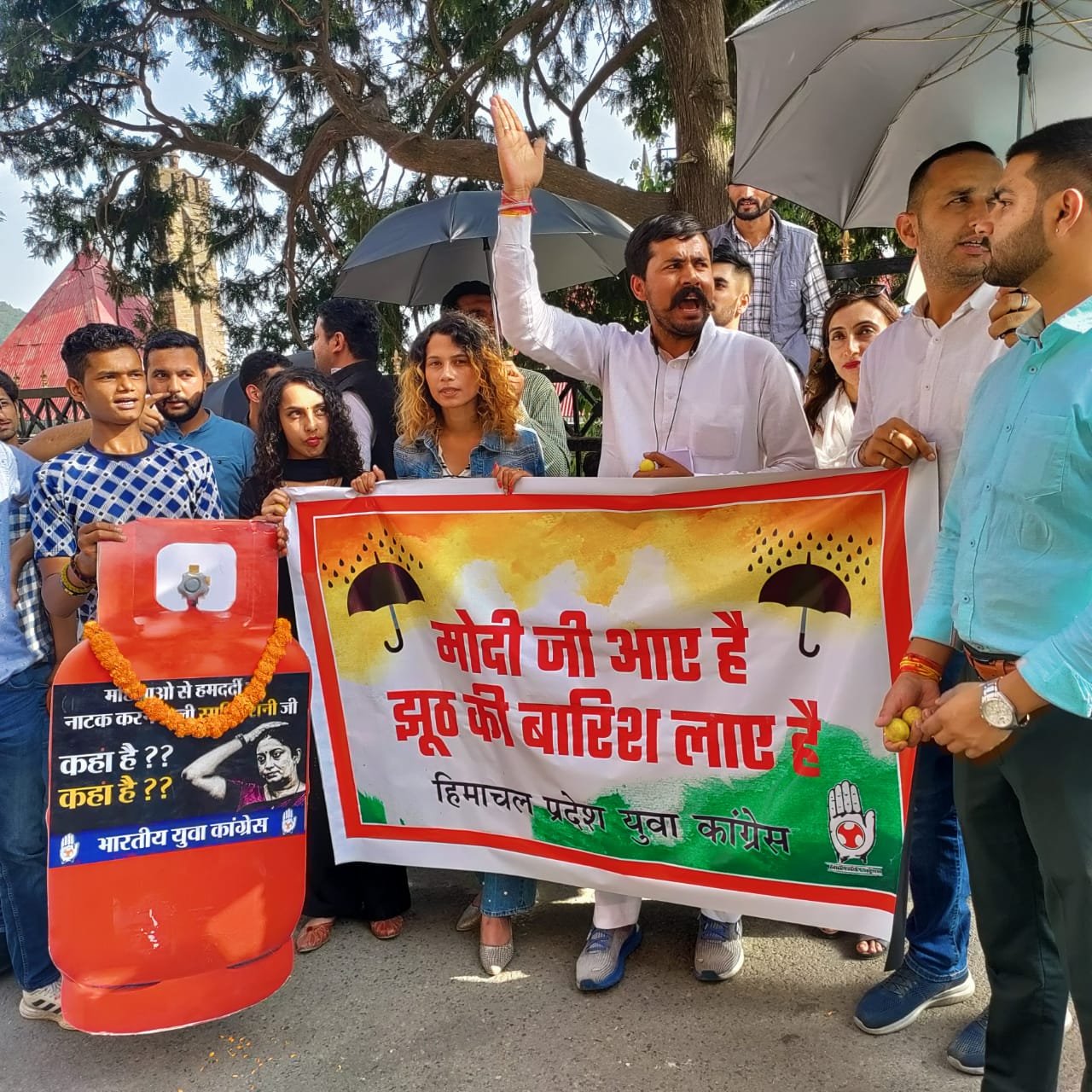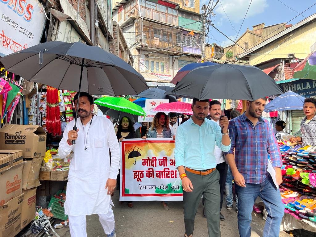 हिमाचल प्रदेश युवा कांग्रेस ने आज प्रदेश कांग्रेस कार्यालय से लेकर ज़िलाधीश कार्यालय तक प्रधानमंत्री नरेन्द्र मोदी के झूठ की बारिश के विरोध में छतरी खोल कर धरना प्रदर्शन किया! प्रदेश युवा कांग्रेस अध्यक्ष नेगी निगम भंडारी ने कहा कि पूरा प्रदेश इस आस में था कि प्रधानमंत्री राज्य के लिये कोई स्पेशल पैकेज जारी करेंगे, लेकिन प्रधानमंत्री ने हिमाचल के लिए कुछ नहीं दिया I प्रधान मंत्री नरेंद्र मोदी लाभार्थियों की संख्या गिनवा रहे थे, लेकिन युवा कांग्रेस मोदी जी से हानि ग्रस्त लोगों की संख्या गिनवाना चाहती है I प्रधानमंत्री जी ये क्यों नहीं बता पाये कि कोविड में 47 लाख भारतीयों की जान गई, GST से 40 करोड़ दूकानदार और परिवारों को नुक्सान हुआ, घरेलु महिलाओं को महंगे किरयाना सामान से हानि हुई, बार-बार पेपर लीक से बेरोजगार युवाओं की हानि, किसान आंदोलन में 700 किसानो की मौत से परिवार जनों की हानि, महंगे खाद बीज और फसल के कम दाम से किसान की कितनी हानि हुई I