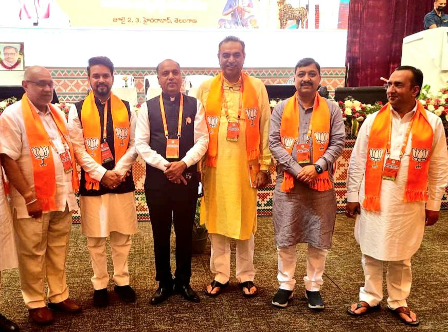 शिमला हैदराबाद में भाजपा की राष्ट्रीय कार्यकारिणी की बैठक में दूसरे दिन रविवार को मुख्यमंत्री जयराम ठाकुर, भाजपा प्रदेश अध्यक्ष सुरेश कश्यप, केंद्र मंत्री अनुराग ठाकुर, प्रदेश प्रभारी अविनाश राय खन्ना, प्रदेश सह प्रभारी संजय टंडन और प्रदेश संगठन महामंत्री पवन राणा ने भाग लिया