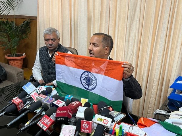 शिमला। भाजपा के प्रदेश महामंत्री त्रिलोक जम्वाल ने कहा कि कांगेस विधायक विक्रमादित्य सिंह प्रदेश की जनता को गुमराह करने की प्रयास कर रहे हैं। उनका यह बयान कि पंचायतों में तिरंगा 200 से 300 में बेचा जा रहा है, बिल्कुल गलत है। विक्रमादित्य सिंह को अपने बयान के लिए जनता से माफी मांगनी चाहिए। हर घर तिरंगा आजादी का महोत्सव कार्यक्रम के तहत केंद्र सरकार द्वारा शुरू किया गया एक कार्यक्रम है। वे सोमवार को शिमला में पत्रकारों से बात रहे थे।