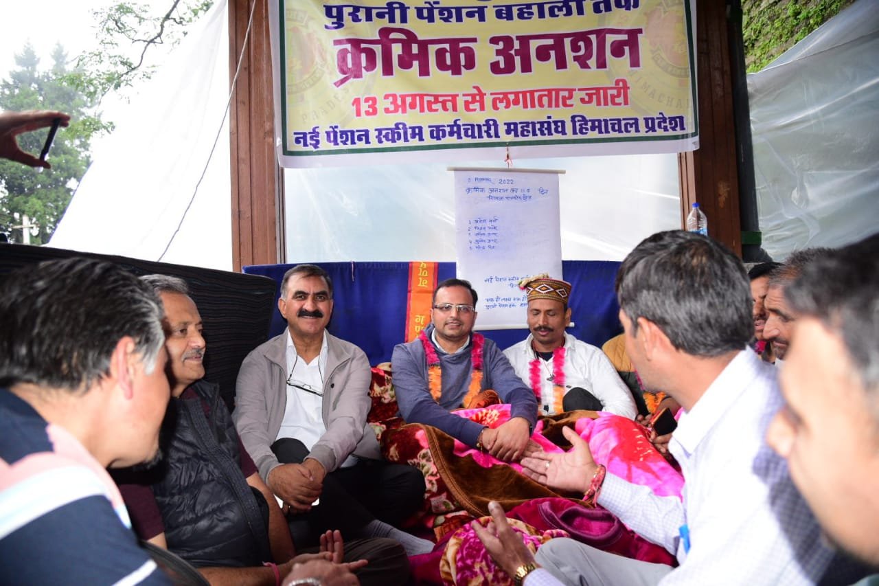 शिमला। पुरानी पेंशन बहाली के लिए कर्मचारी बीते लंबे समय से आंदोलन पर है। वहीं बीते तीन सप्ताह से वे शिमला में क्रमिक अनशन पर बैठे हुए हैं। लेकिन सरकार के कानों पर जूं तक नहीं रेंग रही। हिमाचल कांग्रेस इन कर्मचारियों की मांगो को लगातार उठा रही है। शनिवार को कांग्रेस प्रचार कमेटी के अध्यक्ष सुखविंदर सिंह सुक्खू अनशन पर बैठे कर्मचारियों से मिलने पहुंचे। सुखविंदर सुक्खू अनशनकारी कर्मचारियों के साथ धरने पर बैठे। इस दौरान उनके साथ कांग्रेस मीडिया विभाग के चैयरमैन नरेश चौहान भी थे। सुक्खू ने कर्मचारिचों को आश्वास्त किया है कि सरकार बनते ही कर्मचारियों की पुरानी पैंशन बहाली की जाएगी।