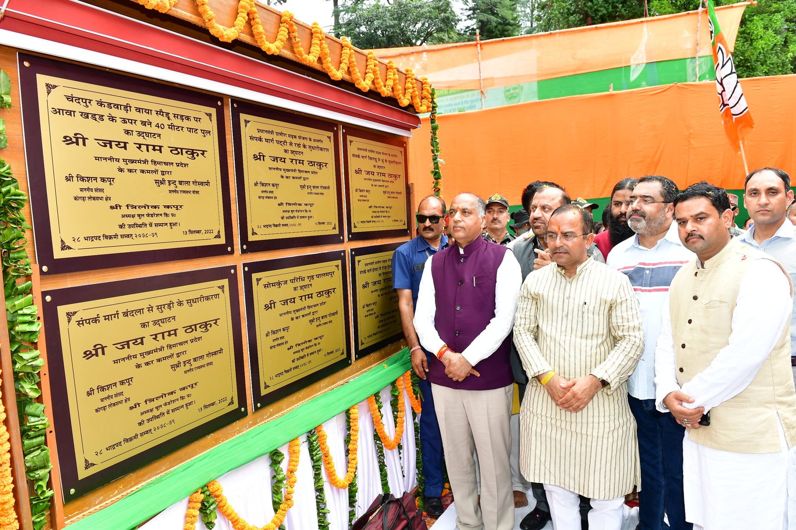 इससे पहले, मुख्यमंत्री ने 4.30 करोड़ रुपये की लागत से निर्मित लाहला-हंगलो-चचियां सड़क, 1.12 करोड़ रुपये से बगोड़ा-भगोटला सड़क के उन्नयन, 61 लाख रुपये लागत की कलूंद-भलेहड़ सड़क, 81 लाख रुपये लागत की डाढ़ उपरिया-डाढ़ झिकली सड़क, 3.91 करोड़ रुपये की न्यूगल पुल-लटवाला सड़क, 1.51 करोड़ रुपये की घार-दत्तल सड़क, 1.68 करोड़ रुपये लागत की घुग्गर-नछीर सड़क, 1.15 करोड़ रुपये की खिलड़ू-भड़ूंन सड़क, 1.64 करोड़ रुपये की पट्टी-रठान सड़क, 4.22 करोड़ रुपये लागत की पालमपुर-लोहना लंघा सड़क, 1.94 करोड़ रुपये की बंदला-सुरडी सड़क, 2.94 करोड़ रुपये की लागत से निर्मित चांदपुर-स्पेड़ू-कंडबाड़ी सड़क और पालमपुर में लगभग 7.79 करोड़ रुपये की लागत से निर्मित सोमकुंज सर्किट हाउस का उदघाटन किया। उन्होंने पालमपुर में नए खंड विकास अधिकारी कार्यालय तथा मतेहड़ (बनूरी) में आयुर्वेदिक स्वास्थ्य केंद्र का शुभारंभ भी किया।