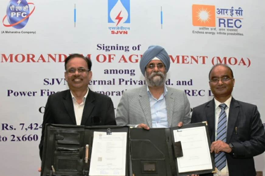 शिमला। एसजेवीएरन के अध्यक्ष व प्रबंध निदेशक नन्दम लाल शर्मा व रविंदर सिंह ढिल्लों, अध्य1क्ष एवं प्रबंध निदेशक, पीएफसी की उपस्थिति में दिल्ली में आयोजित एक समारोह में एसजेवीएन थर्मल प्राइवेट लिमिटेड (एसटीपीएल), पीएफसी और आरईसी के मध्य बिहार के बक्सर जिले के चौसा में अवस्थित 1320 मेगावाट की बक्सर ताप विद्युत परियोजना के ऋण घटक के वित्तपोषण के लिए 8520. 92 करोड़ रुपए का ऋण करार किया गया। इस अवसर पर एसजेवीएन लिमिटेड की गीता कपूर, निदेशक (कार्मिक), ए$के$ सिंह, निदेशक (वित्त) और सुशील शर्मा, निदेशक (विद्युत), आरईसी के अजय चौधरी, निदेशक (वित्त), विजय कुमार सिंह, निदेशक (तक$), पीएफसी की परमिंदर चोपड़ा, निदेशक (वित्त), राजीव रंजन झा, निदेशक (कार्मिक), मनोज शर्मा, निदेशक (सिविल) एसटीपीएल के मनोज कुमार, सीईआे व मनोज कुमार, सीएफआे भी उपस्थित रहे।