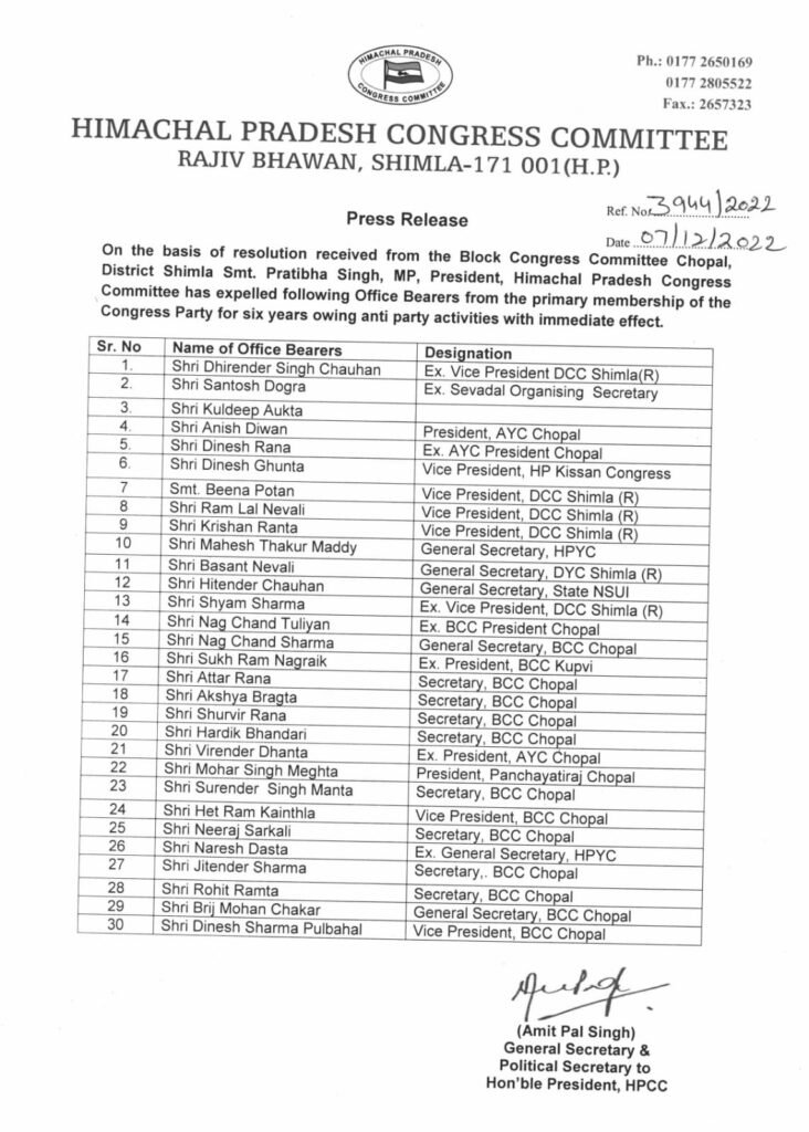 चौपाल कांग्रेस के 30 पदाधिकारी निष्कासित