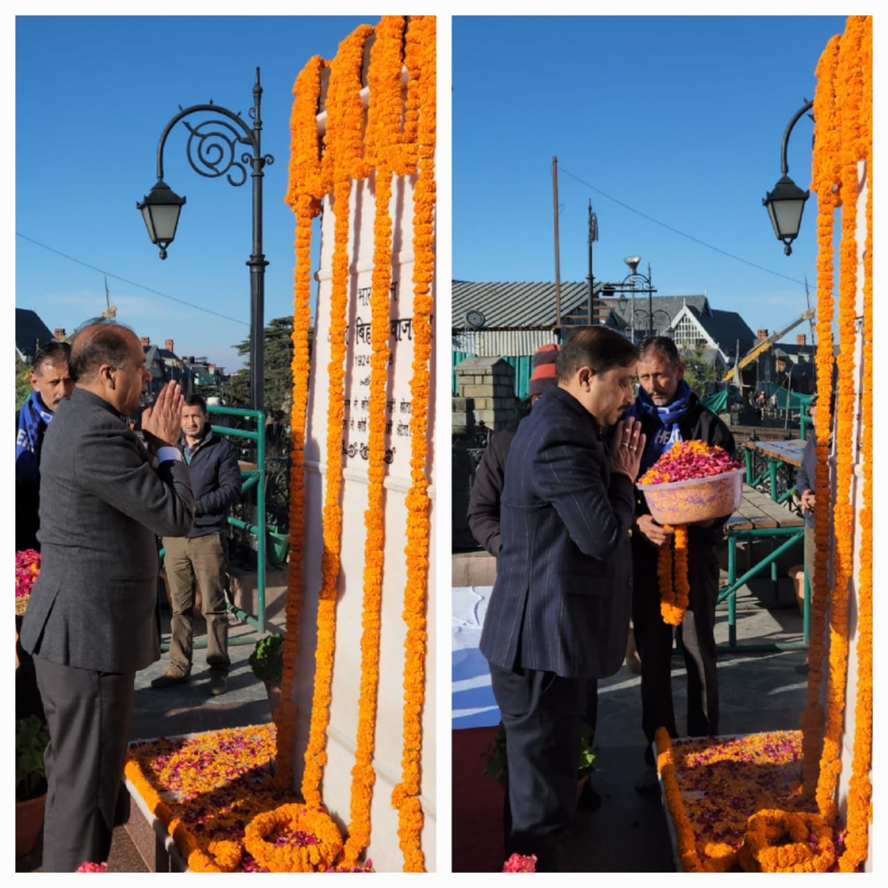 शिमला, भाजपा पूर्व प्रधानमंत्री स्व अटल बिहारी वजपेयी के जन्मदिन को सुशासन दिवस के रूप में मनाती है इस उपलक्ष में पूर्व मुख्यमंत्री जयराम ठाकुर, भाजपा प्रदेश अध्यक्ष सुरेश कश्यप, प्रदेश प्रभारी अविनाश राय खन्ना,मंगल पांडे, सतपाल सत्ती विपिन परमार, रणधीर शर्मा,त्रिलोक जम्वाल, राकेश जम्वाल और अन्य भाजपा दिग्गज नेताओं ने रिज मैदान पर अटल बिहारी वाजपेयी की प्रतिमा पर पुष्पांजलि अर्पित की।