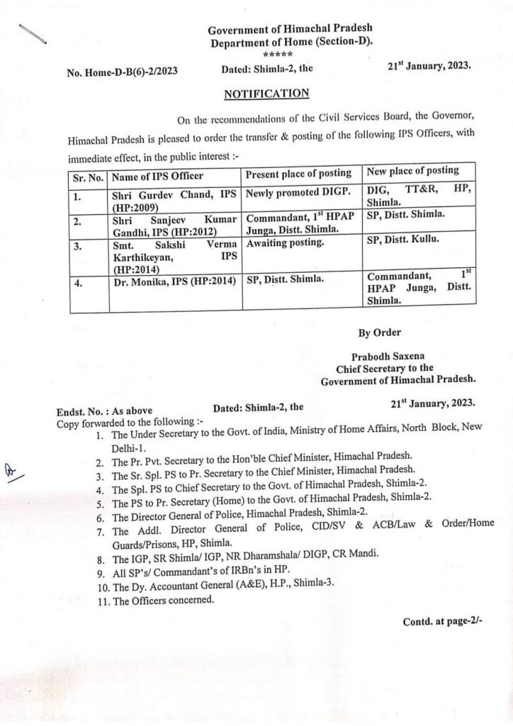 शिमला, प्रदेश सरकार ने शनिवार देर रात 4 आईपीएस अधिकारी तबादले किए हैं। शिमला व कुल्लू के एसपी को बदला गया है। अब संजीव कुमार गांधी शिमला व साक्षी वर्मा कुल्लू की एसपी होंगी। इसके अलावा गुरदेव चंद डीआईजी टीटीआर व शिमला की एसपी मोनिका भुटूंगरु को फर्स्ट एचपीएपी जुन्गा में कमांडैंट लगाया गया है।