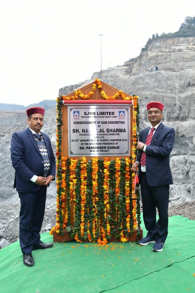 शिमला। एसजेवीएन अध्यक्ष व प्रबंध निदेशक नंद लाल शर्मा ने हिमाचल प्रदेश में निर्माणाधीन 66 मेगावाट धौलासिद्घ जलविद्युत परियोजना का दौरा किया। अपने दौरे के दौरान नंद लाल शर्मा ने सनोटू, हमीरपुर में बांध कंक्रीटिंग कार्य का बटन दबाकर शुभारंभ किया। डैम पिट और नदी के दोनों किनारों पर खुदाई का कार्य पूरा होने के साथ आज बांध की कंक्रीटिंग का कार्य आरंभ हो गया है। अब यह परियोजना निर्माण के अग्रिम चरण में प्रवेश कर चुकी है। उन्होंने सलासी, हमीरपुर में परियोजना कर्मचारियों के लिए गैर-पारिवारिक आवासीय परिसर का भी उद्घाटन किया। परियोजना में कार्यरत कर्मचारियों की सुविधा के लिए इस बैचलर आवास का निर्माण त्वरित गति से किया गया है। यह परियोजना स्थलों पर कर्मचारियों की 247 उपलब्धता की सुविधा के साथ परियोजना निष्पादन में भी तीव्रता लाएगा।