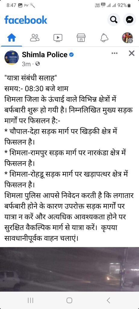 News शिमला पुलिस ने बर्फबारी को लेकर एडवाइजरी जारी की by Himachalaajkal January 29, 2023 Share FacebookTwitterPinterestWhatsApp Previous articleआबकारी विभाग ने प्रदेश में 45 स्थानों पर दबिश देकर 346 लीटर अवैध कच्ची शराब एवं 70 बोतलें बरामद कीNext articleहिमाचल के ऊंचाई वाले क्षेत्रों में भारी बर्फबारी, शिमला के ऊपरी क्षेत्रों में बर्फबारी के बाद का नजारा Himachalaajkalhttp://himachalaajkal.in Get in Touch LEAVE A REPLY Cancel reply Comment: Please enter your comment! Name:* Please enter your name here Email:* You have entered an incorrect email address! Please enter your email address here Website: Save my name, email, and website in this browser for the next time I comment. Related Articles News मुख्यमंत्री की ऊना जिले को 260 करोड़ की सौगात News विकास की दृष्टिकोण से पीछे न रहे चौपाल, मिलजुल कर करेंगे प्रयास : रोहित ठाकुर News राज्यपाल ने धर्मसंघ महाविद्यालय, नई दिल्ली का किया दौराआध्यात्मिक संस्थान भारत की सांस्कृतिक विरासत के संवाहक: राज्यपाल Live Cricket ScoresShimla, Himachal Pradesh weather forecast hourly
