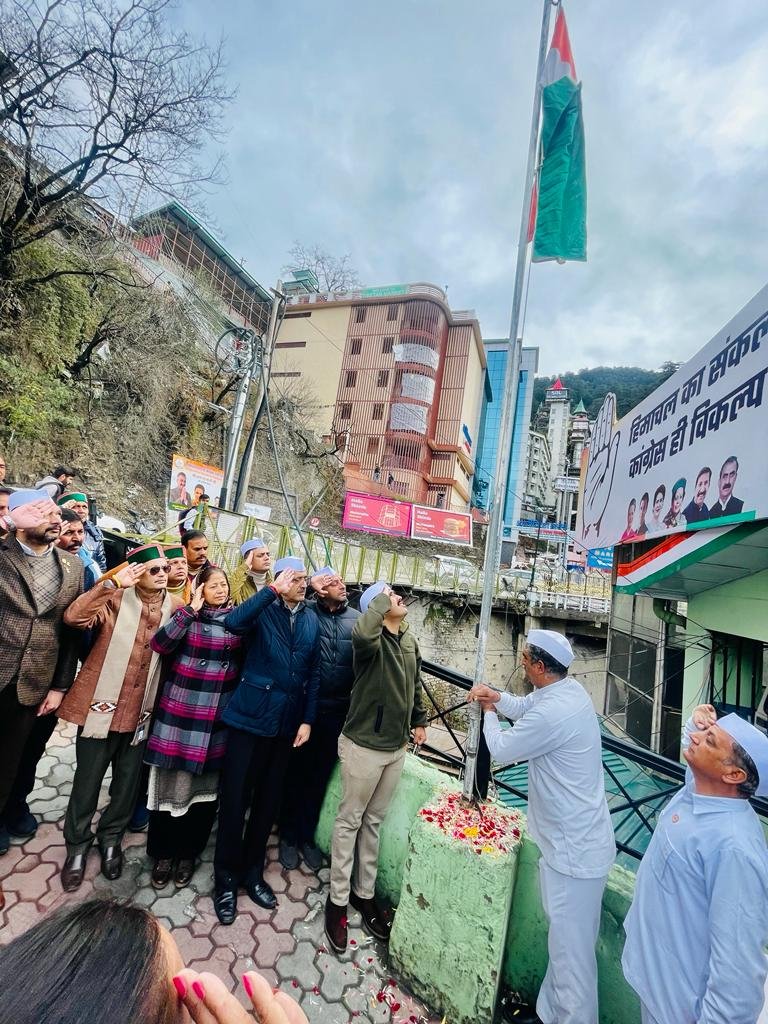 प्रदेश कांग्रेस मुख्यालय राजीव भवन शिमला में सोमवार को राष्ट्रपिता महात्मा गांधी के शहीदी दिवस पर लोक निर्माण मंत्री विक्रमादित्य सिंह व अन्य पार्टी पदाधिकारी श्रद्धा सुमन अर्पित करते हुए व भारत जोड़ो अभियान के पहले चरण के समापन पर पार्टी मुख्यालय में राष्ट्रीय ध्वज फहराते हुए।