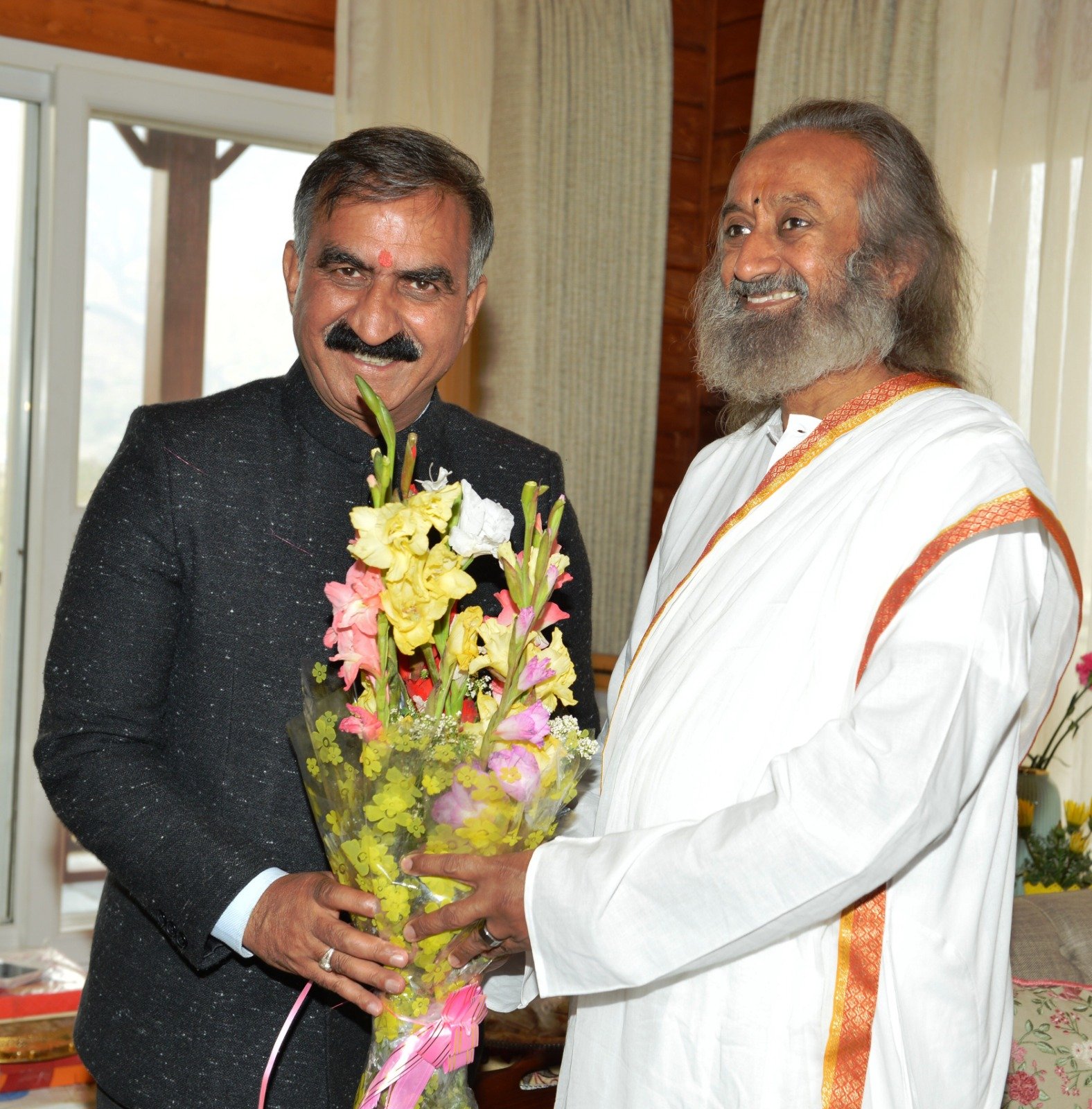 शिमला, मुख्यमंत्री ठाकुर सुखविंदर सिंह सुक्खू ने बुधवार को कांगड़ा जिला के गुजरेहड़ा में आध्यात्मिक गुरू श्री श्री रविशंकर से भेंट की और उन्हें हिमाचली टोपी और शॉल भेंट कर सम्मानित किया।